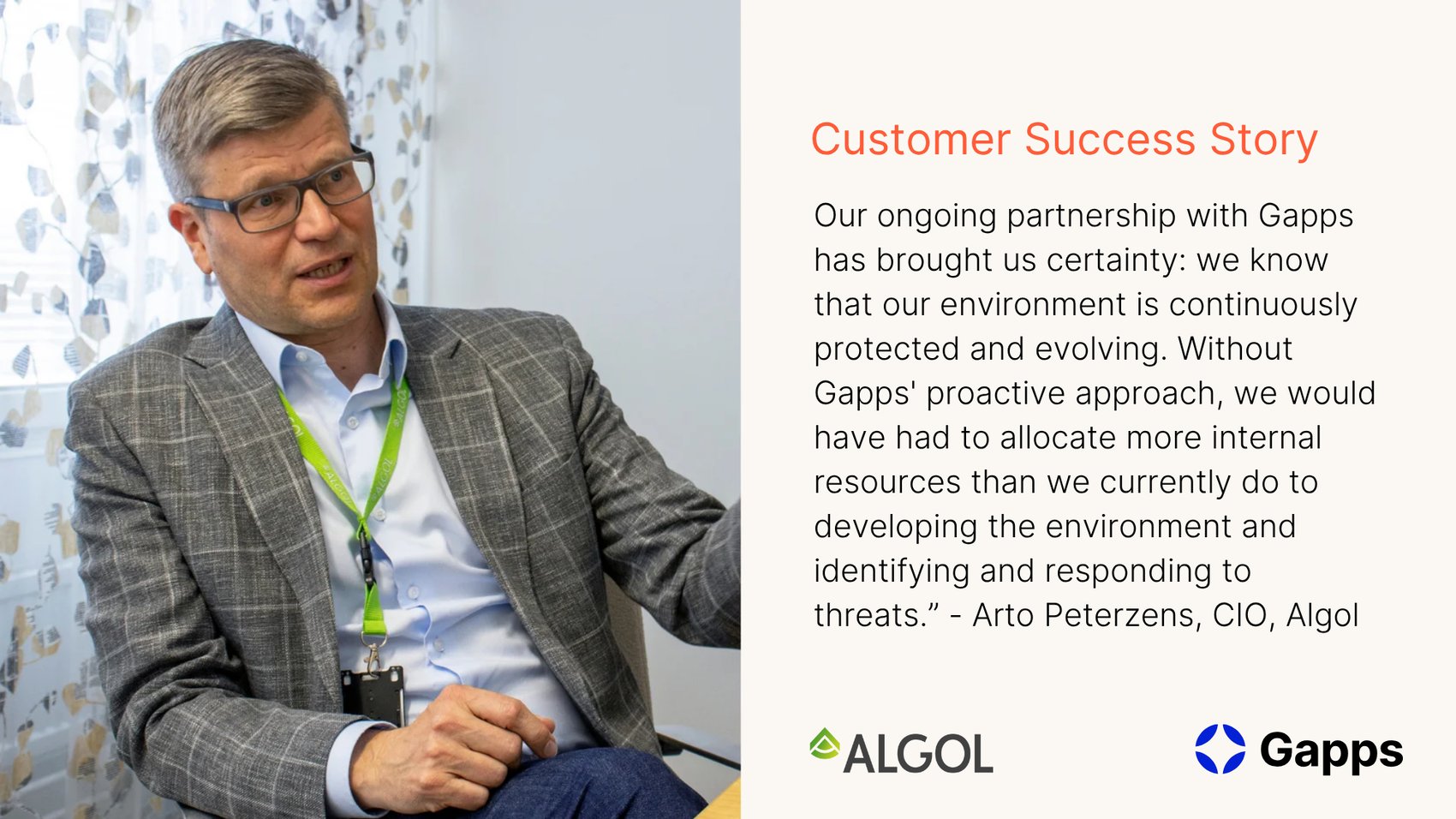 Our ongoing partnership with Gapps has brought us certainty: we know that our environment is continuously protected and evolving. Without Gapps' proactive approach, we would have had to allocate more internal resources than we currently do to developing the environment and identifying and responding to threats.”